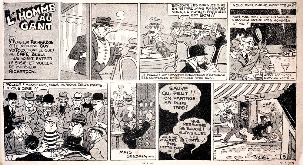 During the uncertainties of the World War II years, Rob-Vel decided to not rely solely on Spirou magazine as a source of income. From 1941 on, he also began a collaboration with the French magazine Pierrot, for which he created a wide variety of serials. Among them were 'L'Homme au Gant' (1941), 'Le Père Purée', 'Ce Pauvre Plouk' (1941-1942), 'Un Ténor a Disparu', 'Le Secret de Kornaki' and 'Le Collier du Bouddha', as well as new adventures of the sailors 'Bibor et Tribar'. However, by May 1942, publication of Pierrot was also cancelled. Unwilling to work for magazines under German supervision, Rob-Vel instead tried his luck in animation, working for the Parisian studios of André Rigal.
