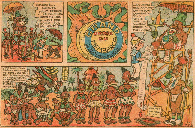 It was during his transatlantic trips on the line Le Havre-New York that Velter made caricatures of the passengers and adorned menu cards and announcement posters with drawings crowded with red-suited bellboys. Among the many onboard celebrities he caricatured have been Mahatma Gandhi, comedy actors like Laurel & Hardy, Charlie Chaplin and Buster Keaton, the Swiss scientist Auguste Piccard, the journalist-adventurer Joseph Kessel and the singers Maurice Chevalier and Joséphine Baker. When Velter noticed Walt Disney on one of these voyages, he didn't have the audacity to ask the famous animator for a job in his studio. He had more luck when meeting the American cartoonist Martin Branner, who invited him to his New York studio. Between 1934 and 1936, Velter lived in the USA, working as maître d' in the Roosevelt restaurant, but also serving as Branner's assistant background artist on the 'Winnie Winkle, the Breadwinner' strip. Learning the trade from an established U.S. cartoonist like Branner gave Velter's own work an "American touch" uncommon among French artists at the time.