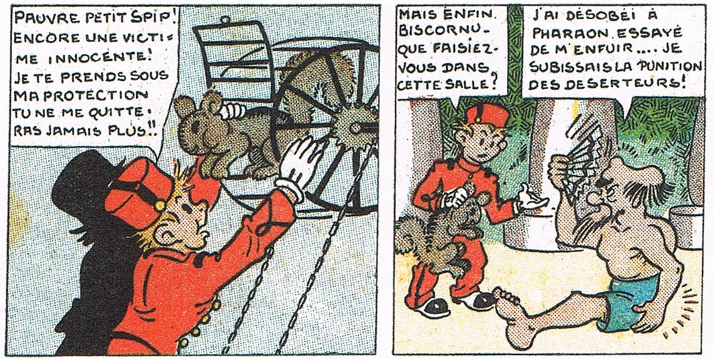 Much like an American newspaper adventure comic, the 'Spirou' serials had an ongoing narrative, with each adventure flowing into the other. During his adventures, Spirou encountered gangsters, mad scientists and even magical creatures. On 8 June 1939, he found a loyal companion in a squirrel, Spip. The choice for this animal was no coincidence, as "Spirou" is Walloon dialect for squirrel. Over the years, Spip remained Spirou's loyal pet sidekick, much like Snowy is for Tintin. During one of his later serials, Spirou was teamed-up with a black strongman called La Puce (literally: "The Flea"), but this character quickly disappeared from the Spirou universe. All in all, Spip is the only secondary character created by Rob-Vel to survive within the series. Most of the other well-known additions to the comic were introduced by the artist's successors, most notably Jijé and André Franquin.