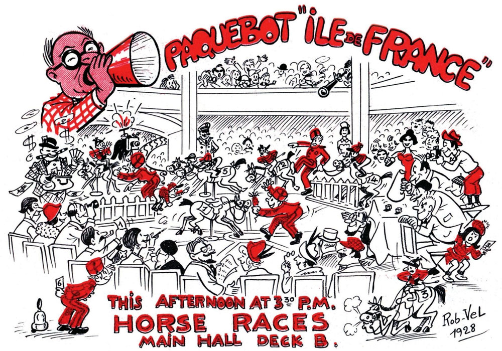 Announcement drawn by Rob-Vel on board of the Île-de-France (1928). The bellhops already bring to mind his future creation, Spirou.