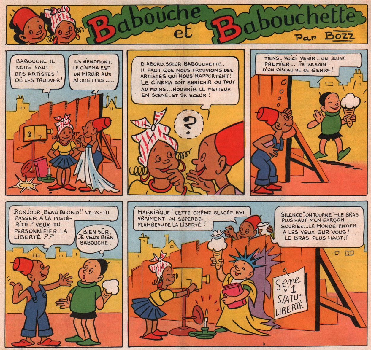 'Babouche et Babouchette' (Lisette, 3 March 1957). The kid is tricked into playing the Statue of Liberty, so that Babouche can scoop away his ice cream.