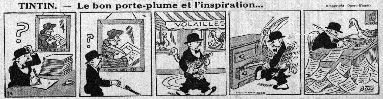 'Tintin', Robert Velter's first comic character and a predecessor to 'M. Subito' (1936). The man portrayed in the painting is 16th-century Dutch writer Desiderius Erasmus.