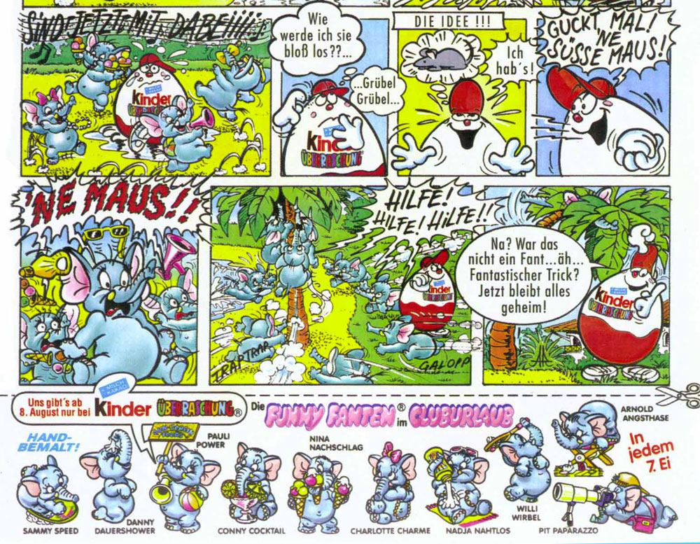 Comic strip with the Elephantos ('Funny Fanten' in German) for Kinder Surprise.