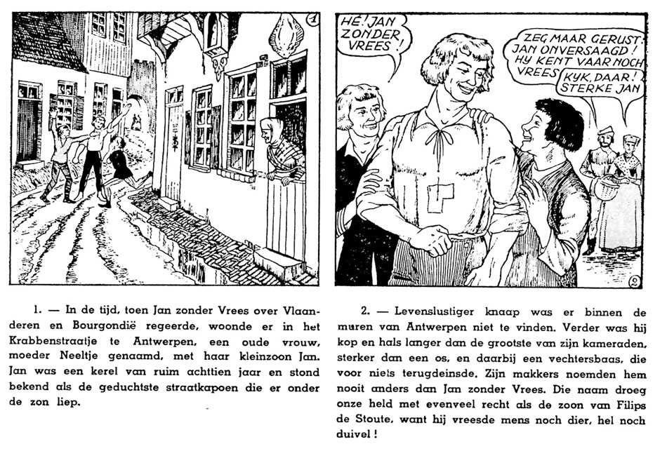 Somewhere in the late 1950s/early 1960s, De Ruyck created a comic strip version of Jan Zonder Vrees ("John the Fearless"), a Flemish folklore hero, popularized by the 1910 children's book written by Constant de Kinder. The stories are set in 15th-century Flanders, where Jan is depicted as a fearless strongman, who happens to have the same nickname as the historical Bourgondian duke John I. De Ruyck drew a total of three stories, all combining a text captions underneath the panels with speech balloons within the images. The first story, 'Jan Zonder Vrees', was a direct adaptation of De Kinder's classic novel. It was followed by 'Jan Zonder Vrees en de Rovers van het Vrijbos', based on Aster Berkhof's 1958 children's novel of the same name. The third and final story, 'Jan Zonder Vrees tegen de Zwarte Ruiter', was written by De Ruyck himself.