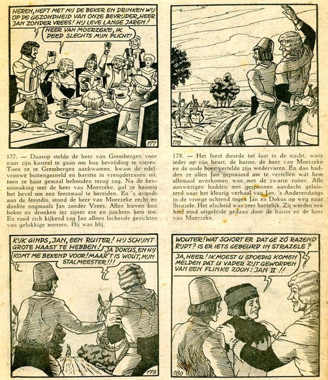 De Ruyck was not the first to make comic adaptations of the 'Jan Zonder Vrees' stories. In 1953-1954, the original De Kinder novel had already inspired a newspaper comic adaptation, drawn by Jan Waterschoot. Between 1970 and 1971, 'Jan Zonder Vrees' appeared in another, more humorous comic book series, drawn by Willem Dolphyn and Jo Lagrillière, AKA Joke. Dolphyn also illustrated several children's books about Jan Zonder Vrees, including a 1976 reprint of Roderyck's 'Jan Zonder Vrees tegen de Zwarte Ruiter'.