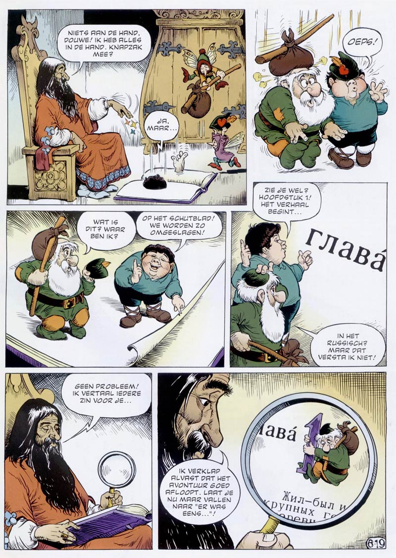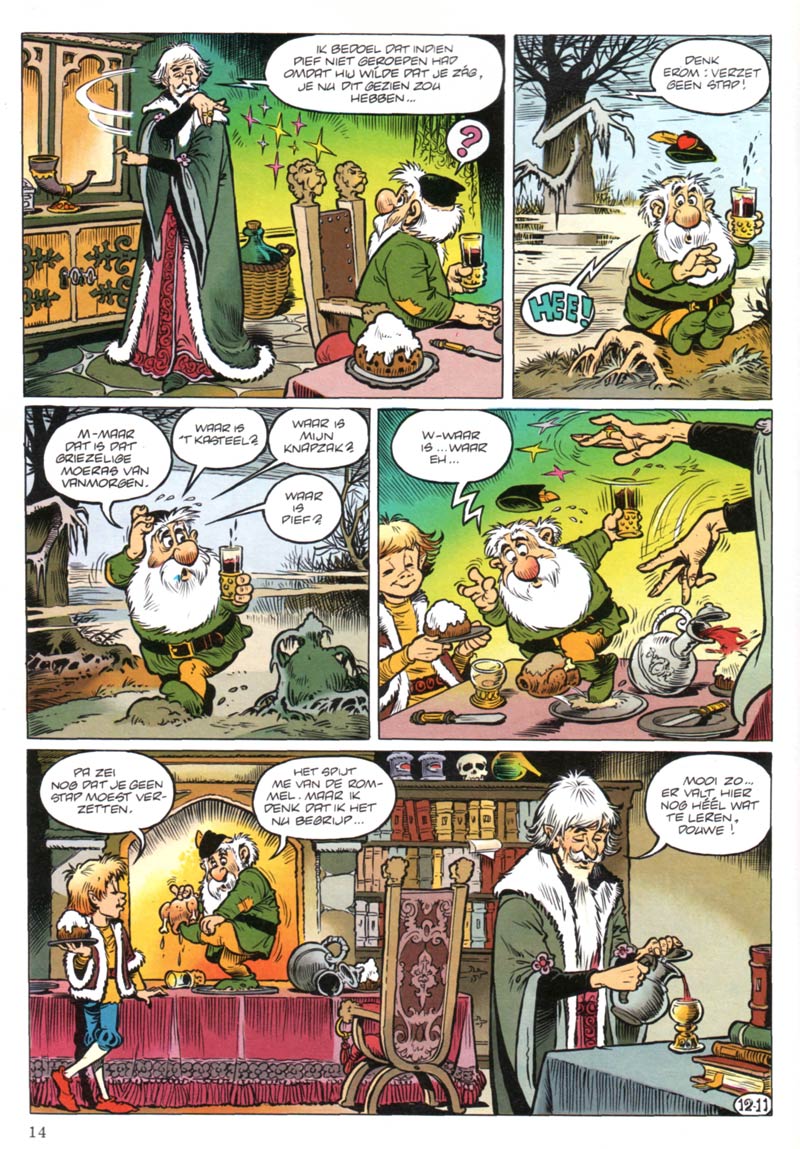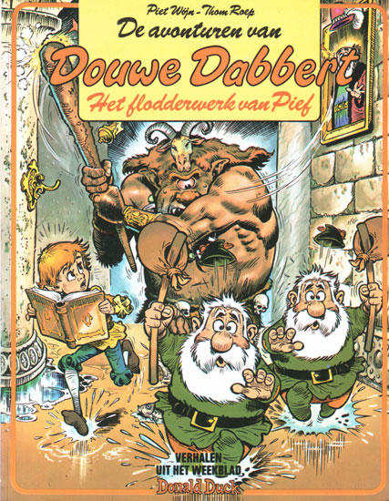 Roep also proved himself able to write comics based on original creations, resulting in the successful comic series 'Douwe Dabbert' (1975-2001) and 'Van Nul Tot Nu' (1982-1994). As he was rummaging through old illustration work in the archives of Oberon's preschool magazine Bobo, his eyes fell upon some work by Piet Wijn. These drawings depicted a dwarf with a huge white beard. Since they had never been used, they were completely forgotten until Roep rediscovered their existence. Hit with inspiration, Roep wrote a one-shot comics story about a spoiled princess with the dwarf, called 'Douwe Dabbert', in a supporting role. It was published in Donald Duck under the title 'De Verwende Prinses' in 1975, and well-received by readers. Already in the same year, Douwe returned in a new story called 'Het Verborgen Dierenrijk'. Douwe Dabbert is a wise little dwarf who owns a magical knapsack. His alliterative name was chosen to be in line with Donald Duck's name. While somewhat rooted in older Dutch gnome stories, like Dick Laan and Rein van Looy's 'Pinkeltje', Jean Dulieu's 'Paulus de Boskabouter' and Phiny Dick's 'Olle Kapoen'. Roep and Wijn's creation was still something different. Most adventures breathe the atmosphere of the 17th century, during the Golden Age of the Netherlands. Some stories are historically realistic, while others have a more fantastical approach, with witches, anthropomorphic animals and evil wizards. Wijn brought everything to life in highly detailed and atmospheric drawings which bring Douwe to all corners of the Earth.