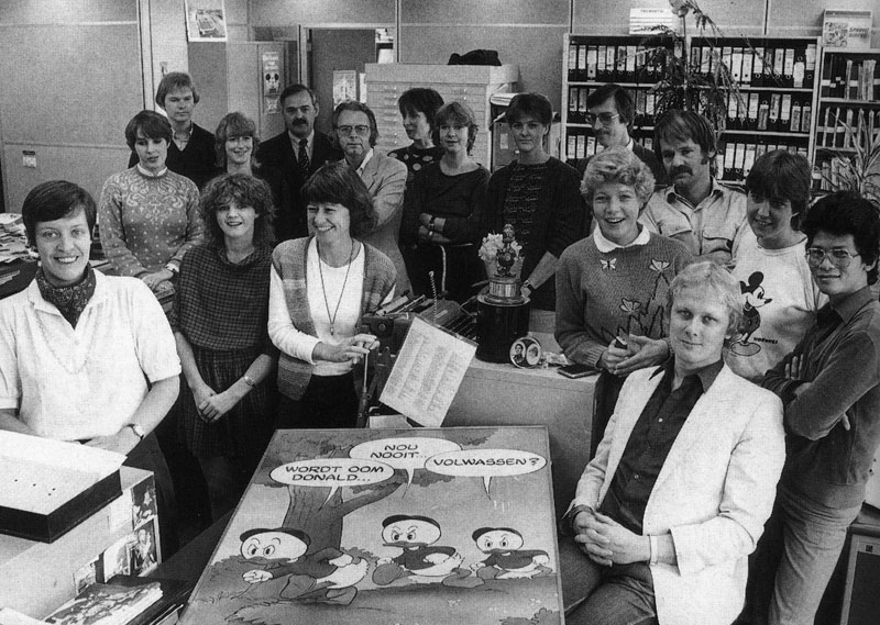 The personnel of the Dutch Disney publications in the 1980. At the front, right: Thom Roep. Also on the picture:: Carla de Vries, Piet Zeeman, Kitty Smit, Pieter van Oppenraaij, Harry Balm, [unidentified person], Marjolein Westerterp, Hellen de Koning, Ed van Schuijlenburg, Co Loerakker (top row), Jos Steenstra, Karin Oldenburg, Conny Verwey, Nelly Wilderom, Joan Lommen, Lucas Abedy (front row).