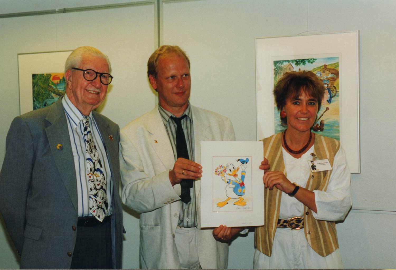Thom Roep and Joan Lommen receiving an original drawing by Carl Barks when the old master visited the Netherlands in 1994.