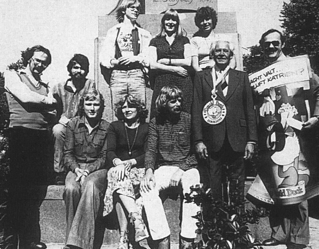 Donald Duck's editorial team in 1976. Standing: Cees de Groot, Daan Jippes, Piet Zeeman, Kitty Smit, Marjolein Winkel, Bartel van de Velde (who made the original license deal in 1952) and Pieter van Oppenraaij. Sitting: Thom Roep, Ineke de Graaff and Wim van Etten.