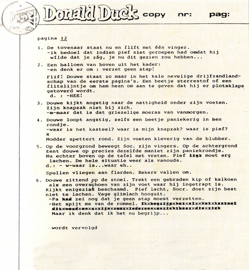 Thom Roep's script for page 12 of the 'Douwe Dabbert' story 'Het Flodderwerk van Pief' (1984), and Wijn's final version.