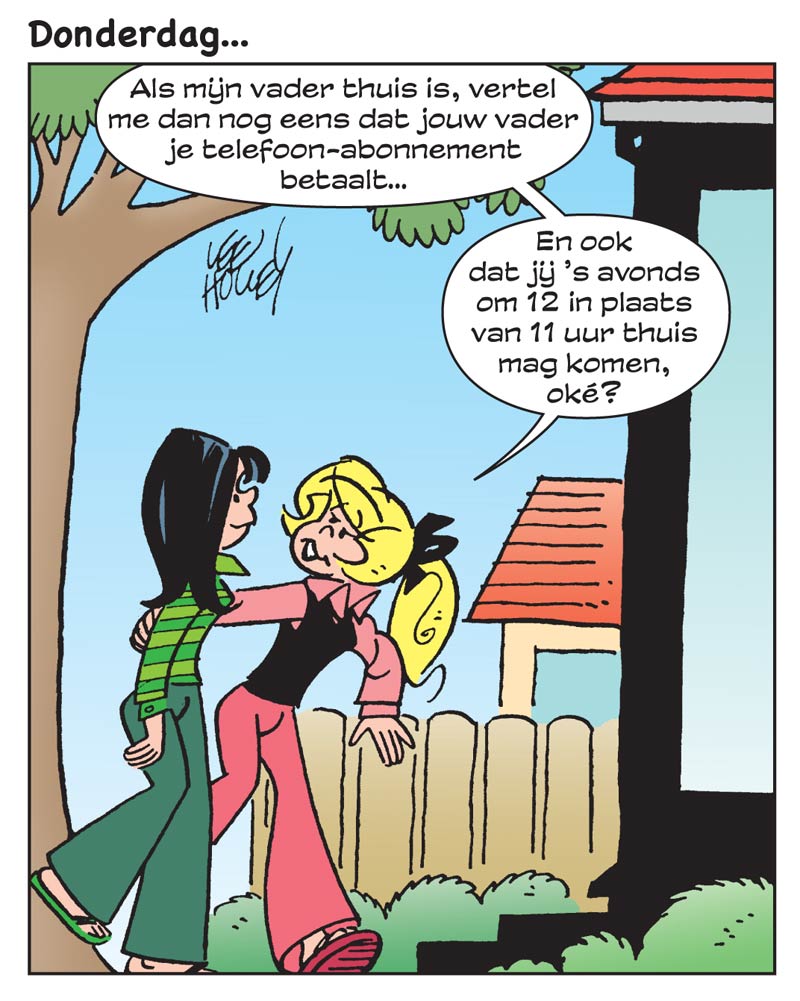 Besides these domestic productions, Roep and Lommen licensed foreign material for publication in Tina. Roep himself took care of the translations of the originally French comic series 'Girlz' by Dentiblù, Douyé and Goupil (published in Tina as 'Marijn & Julie', 2009-2013), and of the reworking and translation of the 1960s/1970s US newspaper comic 'Ponytail' by Lee Holley (published in Tina as 'Madelief' since 2009).