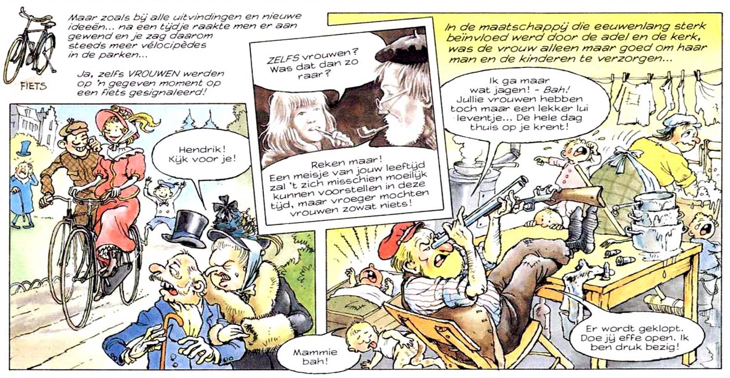 Another way of distinguishing themselves from a schoolly approach was the use of comedy. Yet Roep was aware that children needed to be aware which things were actual facts and what was meant as a joke. He created a framing narrative set in the present time. It centers around a young girl, Ankie Verhagen, who receives private lessons in history from an old, sympathetic and wise man named Methusalem de Tijdt and who is strongly implied to be Father Time. The scenes between Ankie and Methusalem are mostly serious in tone and therefore drawn in a semi-realistic style. Everything he tells her are actual historical facts. The historic events themselves are drawn in a more comedic style, with several (visual) gags, corny puns and nods to other comic series like Carl Barks' 'Uncle Scrooge', Hergé's 'Tintin', Willy Vandersteen's 'Suske en Wiske', Morris' 'Lucky Luke', Martin Lodewijk's 'Agent 327', Reg Parlett's version of 'Billy Bunter' and René Goscinny and Albert Uderzo's 'Astérix'. That way readers could easily distinguish fact from fiction. The use of a narrator also made it possible to avoid coming across as an illustrated essay, which 'L'Aventure des Belges' essentially was. As Methusalem talked, Ankie could make remarks and ask questions, which kept a child's point of view in check. It was also a handy way of criticizing certain historical characters and events that had often been presented as heroic throughout the ages, but could use a little old of the traditional "Dutch soberness" when reflecting on their questionable deeds.