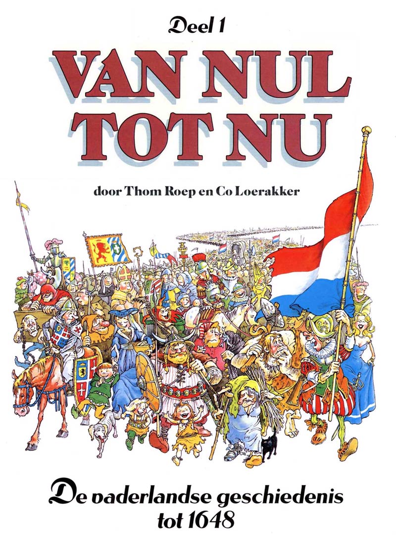 Roep's other masterpiece, 'Van Nul Tot Nu', is a comic series about Dutch national history, drawn and co-written by Co Loerakker. Oddly enough, nobody in the Netherlands had ever created such a project before. There were a few historic predecessors, such as Jacob van Lennep and Jhr. P. van Loon's illustrated picture story 'Tafereelen uit de Geschiedenis des Vaderlands, tot Nut van Groot en Klein' (1854). Between 1904 and 1906, Jan Feith made an illustrated history of the Netherlands using silhouettes, while Bertus Aafjes and Piet Worm created 'De Vrolijke Vaderlandse Geschiedenis' (1948), a humorous look at national history. But all were basically text comics focusing on a few key events. Therefore Roep and Loerakker had to look at other countries' comics to find a study-worthy example. The book 'L'Aventure des Belges' ('België in Beeld' in the Dutch translation, 1979) by Georges H. Dumont and Louis Haché told the history of Belgium in comic strip format, but Roep felt this effort was well-intended yet too dry in its writing and too static in terms of drawings. To appeal to young readers, their comic strip would need to be a lot more dynamic and offer room for some humor. Contrary to 'L'Aventure des Belges' - which was a text comic - Roep and Loerakker decided to make their series a balloon comic. Initially, chief editor Cees de Groot wasn't too keen on the idea, but after seeing a first page he changed his mind and greenlighted the project. The series was named 'Van Nul tot Nu' (literally: "From Zero to Now") and between 1982 and 1987 serialized in the Dutch Disney weekly Donald Duck.