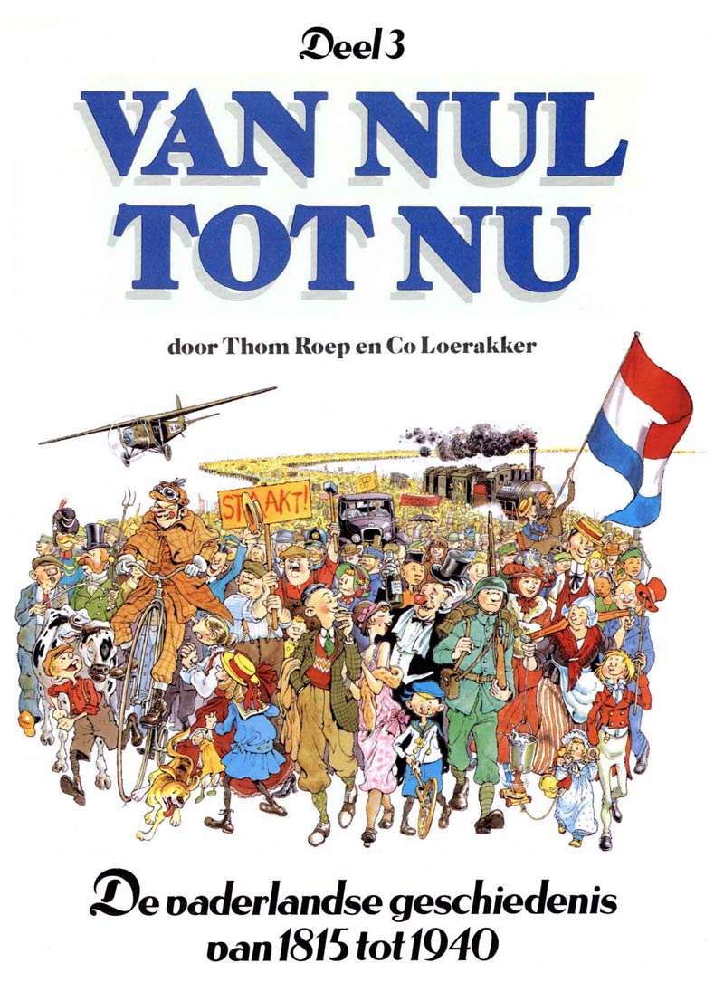The original series of 'Van Nul tot Nu' was published in four volumes by Oberon between 1984 and 1987, and later republished by Big Balloon. The first volume covers prehistory until 1648, the year in which the Treaty of Münster was signed, which ended the Eighty Years' War between Spain and the Netherlands. Roep attributed this overwhelming condensation of thousands of centuries' worth of history to their naïve idea that they could fit it all in one book. Luckily, readers responded so enthusiastically to the comic that their publisher saw no problem in completing the project with extra volumes. This made Roep and Loerakker take a slower pace to tell next centuries' events. The second volume covers all events from 1648 until the founding of the Dutch independent state in 1815. The next volume collects all Dutch history from that date until the start of the Second World War in 1940, while the fourth and final volume encapsulates the Second World War and the rest of the 20th century. This specific volume was notable for having more scriptwriting input by Loerakker, who was not only three years older than Roep but also more interested in this part of history. When the volume was updated and expanded in 1999 and 2003, Loerakker once again took over the majority of the script. He added more scenes about events in the late 1980s until the late 1990s and removed some timely dialogue. In 1994, a fifth volume came out, about the history of daily life. This collection of shorter, self-contained stories tells the history of food, houses, writing, crime and sexuality. Because Big Balloon had taken over the book publishing activities of Oberon, these installments were almost all serialized in Big Balloon's magazine Sjors & Sjimmie Stripblad. Except for the history of sexuality, which had more mature content. The remaining pages were filled with two-page illustrations depicting various moments in history, including the Stone Age, Roman period, Middle Ages, baroque, the Industrial Revolution and our age. These drawings were originally published in Donald Duck and also made available as a calendar.