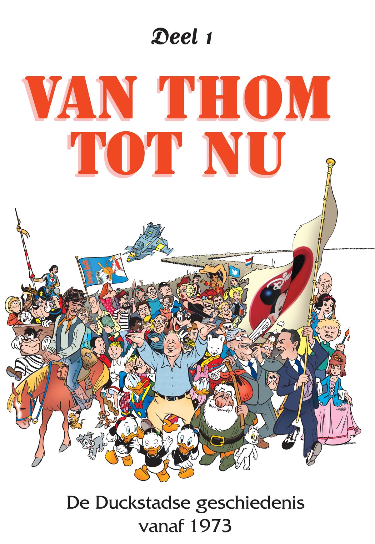 During his farewell party, Thom Roep received two books compiling all the (short) comics he wrote for Donald Duck and Tina, and a compilation of his longer serials like 'Douwe Dabbert' and 'Van Nul Tot Nu'. These were alternated with old interviews, pictures and memories of (ex-)colleagues. The books were compiled by editors Ferdi Felderhof and Bas Schuddeboom, and the first book had an original drawing by the members of the editorial art studio (Viktor Venema, Jan-Roman Pikula, Michel Nadorp, Wilma van den Bosch, Frans Hasselaar). It is a march of Thom's own creations, colleagues and favorite comic characters, in the style of the 'Van Nul Tot Nu' covers. The second book contained an older drawing for a 'Douwe Dabbert' poster by Dick Matena, featuring Piet Wijn and Thom Roep. Both books were published in a limited edition of four copies, only for Thom and his family.