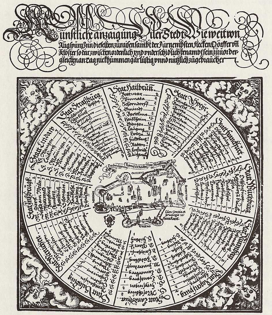 Between 1560 and 1563, Rogel created a scale model of the city of Augsburg. He used his research to prepare a so-called "Augsburg mileage disc", showing Augsburg in the center of the page, with all neighboring cities and villages around it. Travelers could then measure the distance between Augsburg and other cities. It also pointed out the closest roads to these locations. Rogel based much of his information on Jörg Gail's 1563 travel guide 'Raißbüchlin' ('Travel Booklet').