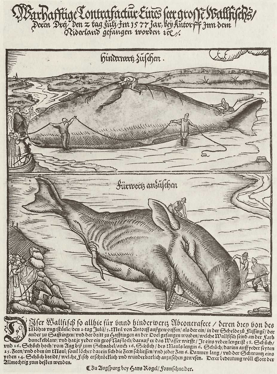 Rogel's engraving of a beached whale in Antwerp in 1577, 'Riesenwalfisch bei Antwerpen', is also interesting for comic historians. It depicts the sea mammal from two different perspectives, divided in two sequential illustrations. The first panel shows the enormous beast from the back, while people are taking measurements. The second panel has a front view.