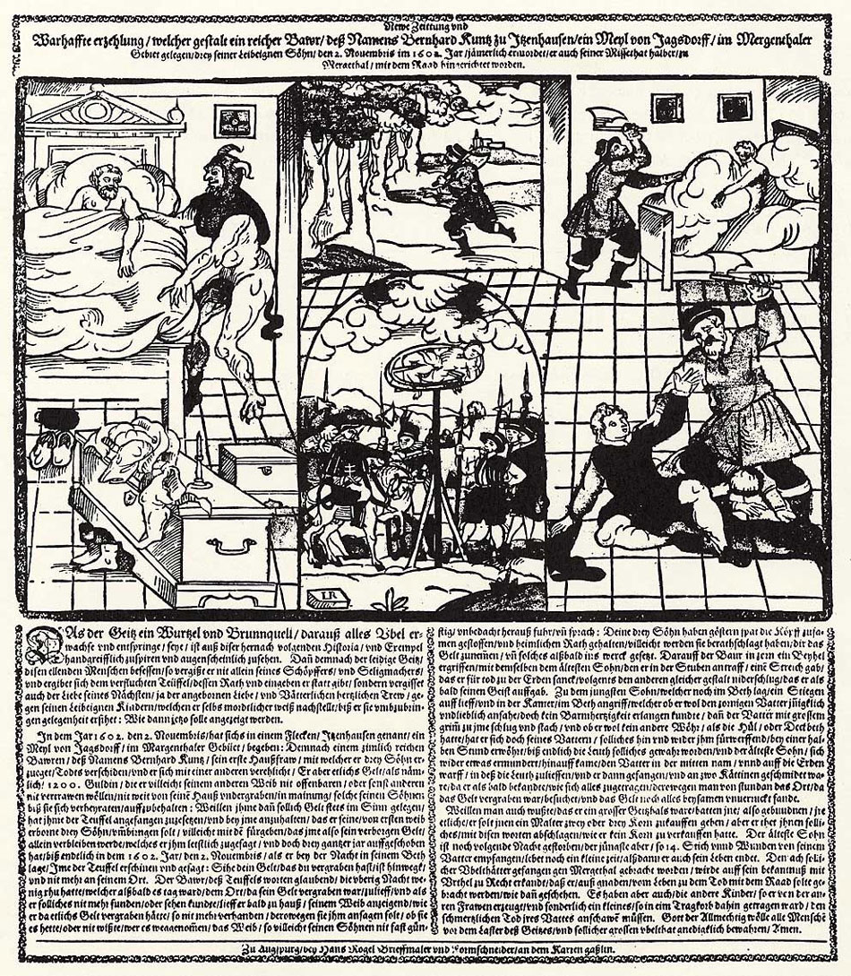 In 1602, Rogel made the engraving 'Mord in Itzenhausen', about a murder case in Itzenhausen. On 2 November 1602, the farmer Bernhard Kuntz killed his three sons. He was arrested, tortured and executed afterwards. Rogel illustrates the events in five separate scenes. This makes his engraving very reminiscent of a modern-day text comic, with the story written underneath the images. However, the lay-out can be a bit confusing to follow. The storyline begins in the upper left corner, when Kuntz is awakened by the Devil to perform his ghastly deed. The narrative then has to be read clockwise. In the next panel Kuntz runs to the woods, carrying an axe with him. He murders one of his children in bed, hacking down the two others on the floor. In the final panel Kuntz is executed on the breaking wheel.