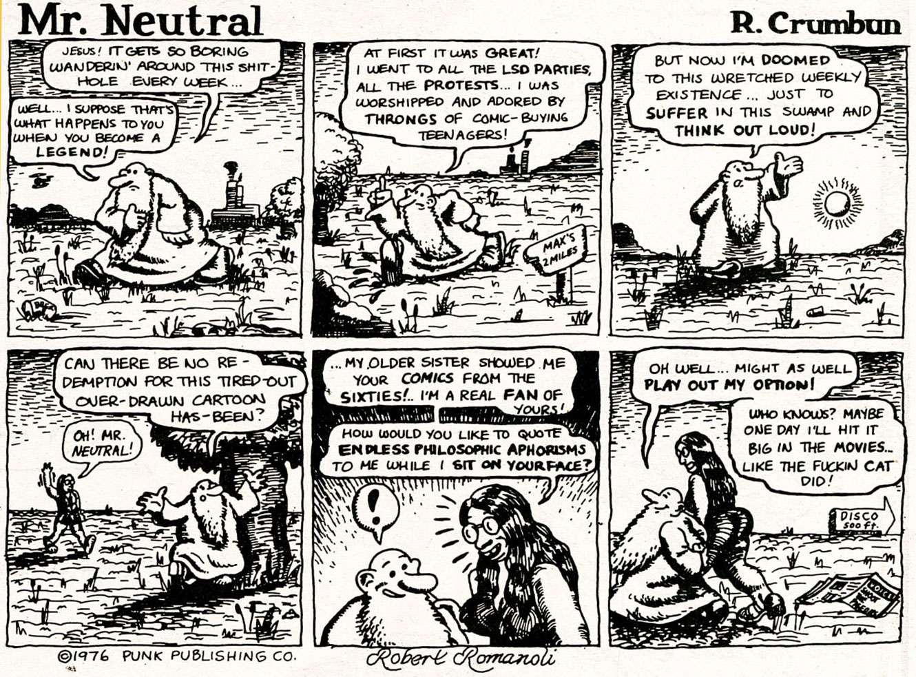 However, most fans at the time weren't aware of Crumb's dire situation. Some were disappointed with his Mr. Natural story in The Village Voice, which felt as if he had "sold out". Contrary to previous 'Mr. Natural' stories in underground magazines, this Village Voice serial had no controversial elements. There were no political commentary or sleazy sex scenes. Robert Romagnoli was one of the Crumb fans who felt the 'Mr. Natural' story in The Village Voice lacked focus and above all bite. In issue #5 of Punk (August 1976) he drew a parody of Crumb's signature comic titled 'Mr. Neutral' by "R. Crumbun". In this spoof, Mr. Natural describes himself as a "tired-out overdrawn cartoon hasbeen" who was "doomed to this wretched weekly existence (...) just to suffer in this swamp and think out loud!". When Flakey Foont's wife Ruth asks him out for sex, Natural takes her offer, because "maybe one day I'll hit it big in the movies... like the fuckin' cat did", referencing Ralph Bakshi's film adaptation of 'Fritz the Cat', which Crumb notoriously hated.