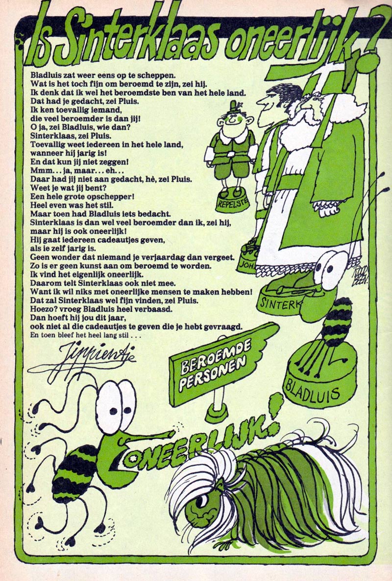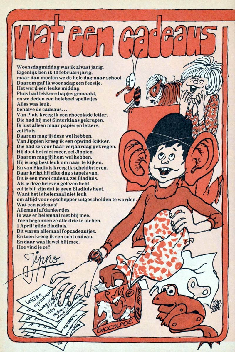 Besides Olidin, Roodbeen's illustrations appeared in women's magazines like Margriet and the local newspapers Rotterdamsch Nieuwsblad and Haagsche Courant, while he made political cartoons for Elsevier. In the 1970s, Roodbeen made comic strips and drawings for the Malmberg school magazines Okki, Taptoe and especially Jippo, for which he illustrated the opening pages that welcomed the reader. He also provided illustrations for educational publications by the publishing house Wolters-Noordhoff.