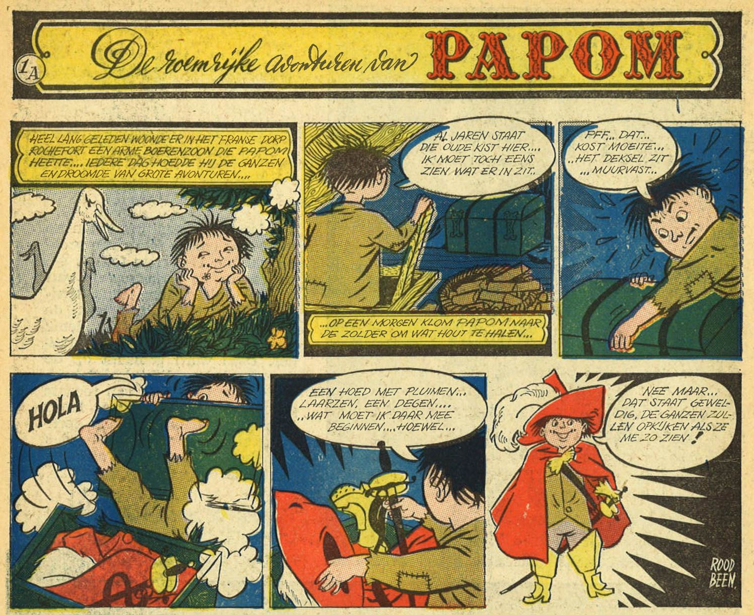 Between 1958 and 1963, Roodbeen was one of the regular comic artists for Olidin, a promotional children's magazine for petrol company Shell, produced by the Van Maanen advertising agency. Roodbeen drew six stories of the Arabian hero 'Ahmed' between 1958 and 1961, followed by the balloon comic 'De Roemrijke Avonturen van Papom' in 1962-63. Along with Dick Vlottes, Roodbeen was one of the artists of Olidin's short historical true stories and gag strips. Other important contributors to Olidin were Emile Brumsteede, Wim Giesbers, Frits GodhelpFriso Henstra, Niek Hiemstra, Hans G. Kresse, Jan Kruis, Ted Mathijsen, Joost Rietveld, Jan van der Voo, P. Visser, Dick Vlottes, Carol Voges, Joop Wiggers and Piet Wijn