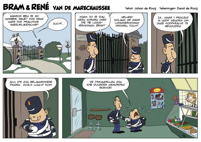 'Bram & René van de Marechaussee'. René (the tall one) is concerned about only receiving a 1% raise, but Bram (the short one) comforts him. Only to cry when discovering the frikandel snacks have become 10% more expensive.