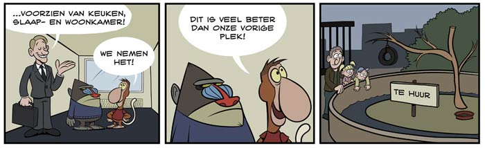 Webcomic by David de Rooij. Translation: "It has a kitchen, bed and living room!" - "We take it. It's far superior to our previous place." - "For rent."