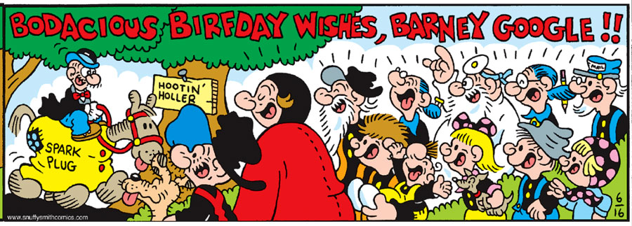 On Monday 17 June 2019, 'Barney Google and Snuffy Smith' celebrated its 100th anniversary. In the two weeks leading to the landmark event, John Rose and King Features Syndicate gave many notable characters from the strip's long run cameo appearances. Snuffy also had a run-in with characters from other long-running newspaper strips, such as Popeye and Blondie's Dagwood Bumstead.