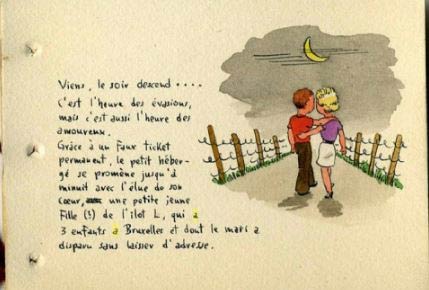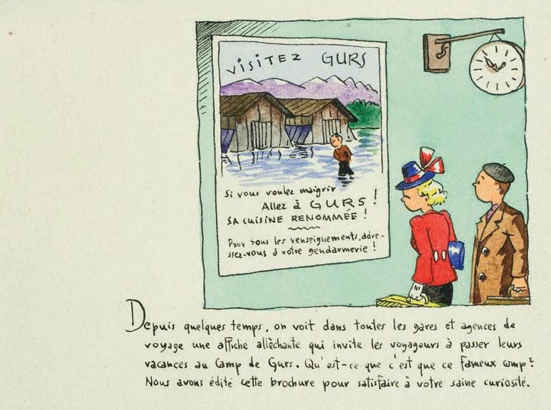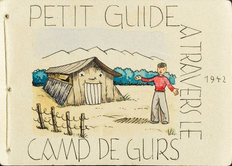 All three of Rosenthal's books are written and drawn in ink and watercolor. 'La Journée d'un Hébergé' (1940) records every aspect of daily camp life, hour by hour, in a text of 18 pages in length. Rosenthal mentions the mandatory marches, interrogations, the lousy meals and a romantic walk with a female prisoner (which might have been autobiographical). 'Petit Guide à Travers le Camp de Gurs' (1942) is more humorous in tone. In 13 pages it describes all locations and daily events in Gurs, including his fellow prisoners and wardens, as if it was a tourist guide.