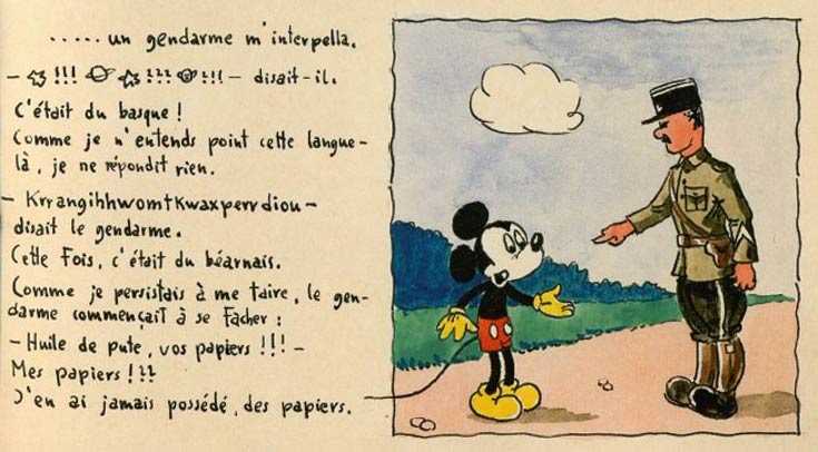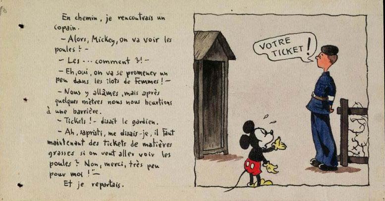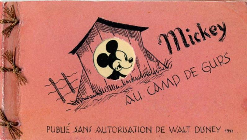 Yet most media attention has gone to the peculiar 'Mickey au Camp de Gurs' (1940). The work is a text comic, 16 pages long, with all text written alongside the images. It stars Mickey Mouse, a fact that Rosenthal ironically acknowledges in the title: "Publiée sans l'authorisation de Walt Disney" ("Published without Walt Disney's authorisation"). The comic is a strange clash between childish innocence and the harsh reality of Nazi politics and war. Mickey is portrayed as a happy but naïve individual, much like in Disney's cartoons and Floyd Gottfredson's comics. He is arrested by Vichy soldiers for not having any identity papers with him. The judge interrogates him and is perplexed that Mickey has "no mother, only a father: Walt Disney." He suspects the rodent of being Jewish and therefore sentences him to be imprisoned in camp Gurs. There Mickey witnesses camp life and its repressive rules with innocent but poignant observations. Eventually he has enough of all this misery and erases everything with a literal eraser, whereupon he returns to the United States.