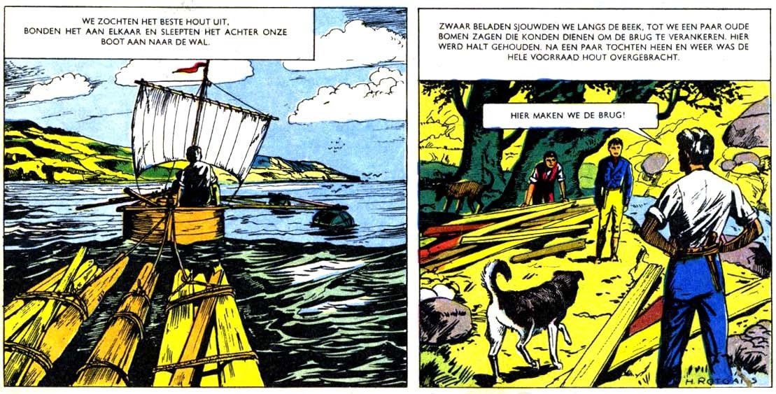 During the 1950s, Rotgans served as one of the most prominent illustrators for De Spaarnestad's children's publications, along with Boy ten Hove, Frans Piët, Hans Ducro, Jan Giling, Piet Broos, Mies Deinum, Nico van Dam and Bert Bus. Apart from Tombola, he also illustrated text stories in Rebellenclub and Grabbelton, the semi-identical children's supplements of Panorama and Katholieke Illustratie. He was additionally present in Rebellenclub's successor, the comic magazine Sjors, launched in 1954. He illustrated new text stories, and later made heavily captioned comic adaptations of the literary classics 'Treasure Island' ('Schateiland', 1963-1964), 'Swiss Family Robinson' ('De Schipbreukelingen', 1965), and 'The Prince and the Pauper' ('De Prins en de Bedelaar', 1966-1967).