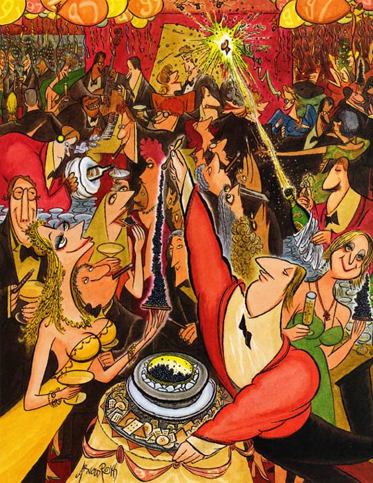 A highly praised artist, Roth has received many awards, including the National Cartoonists Society Advertising and Illustration Award, the Magazine and Book Illustration Award (both three times), the Illustration Award (twice) and the Reuben Award (in 1983). Classic English artists like James Gillray, Thomas Rowlandson and George Cruikshank, as well as cartoonists from his own lifetime like Otto Soglow and Ronald Searle can be ranked among his influences, while his passion for jazz shows in his preference for improvisations with the pen. Novelist John Updike ('Run, Rabbit, Run') once described him as: "All cartoonists are geniuses, but Arnold Roth is especially so."