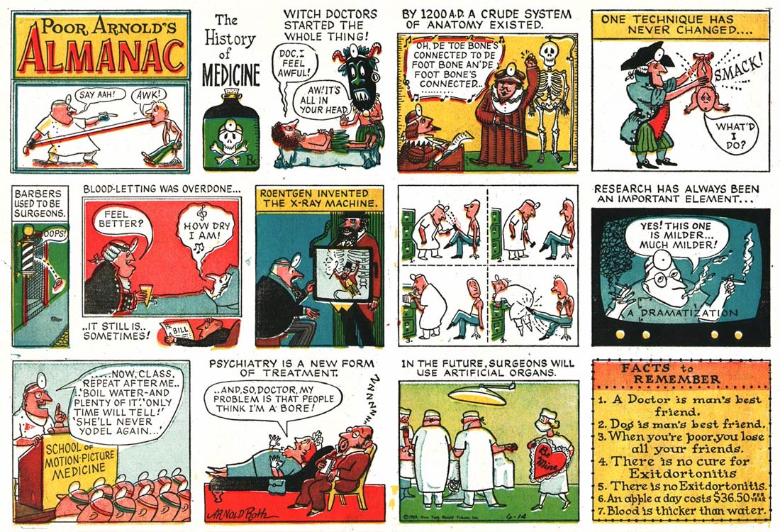 Roth also had a syndicated comic strip called 'Poor Arnold's Almanac', in which the cartoonist delved into a different subject every week. It originally ran as a Sunday feature through the New York Herald Tribune Syndicate from 1959 to 1961, and reappeared as a daily through Creators Syndicate in 1989-1990. Roth's work has been exhibited throughout the US and Europe, and he has made illustrations for advertisements, books and jazz and folk album covers (a.o. Dave Brubeck).