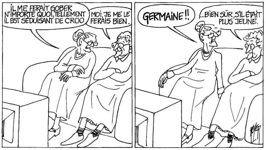 Cartoon by Royer. Translation: "He could make me swallow anything, De Croo [referring to politician Herman De Croo] is that attractive." - "I would do it too." - "GERMAINE!!" - "Certainly, if he were younger."