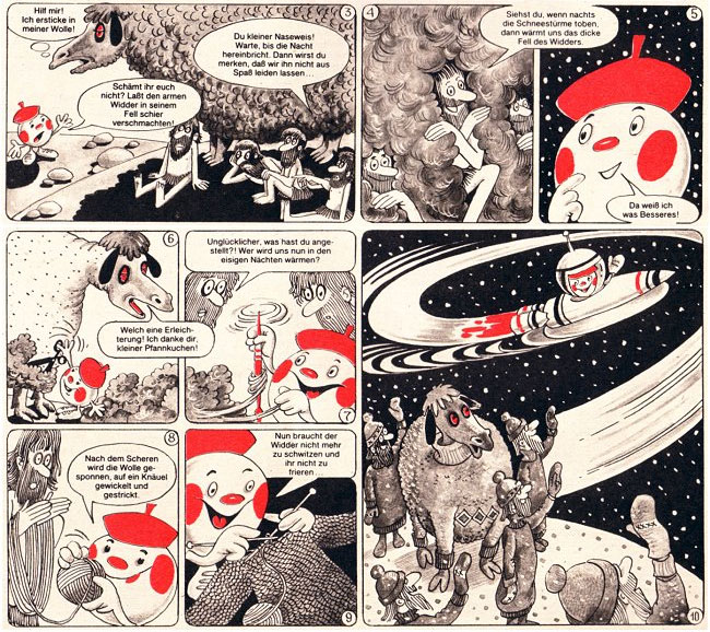 Several of Romantsev's children's comics were additionally translated for the East-German children's magazines Freien Welt and Sputnik. His appearances in Freien Welt included 'Kolobok' (17 episodes, 1981-1982) and 'Kolobok bei den Sternbildern' (13 episodes, 1987-1988), both starring the East Slavic bread-like fairy-tale character Kolobok. His other serials were the fairy tale adaptation 'Die zwölf Monate' (15 episodes, 1984-1985) and 'Der Zauberer Hottab' (16 episodes, 1987), based on a Lasar Lagin tale. In 1986, Sputnik magazine ran his five-part comic story based on the science fiction story 'The Inhabited Island' ('Die Bewohnte Insel') by Arkady and Boris Strugatsky.