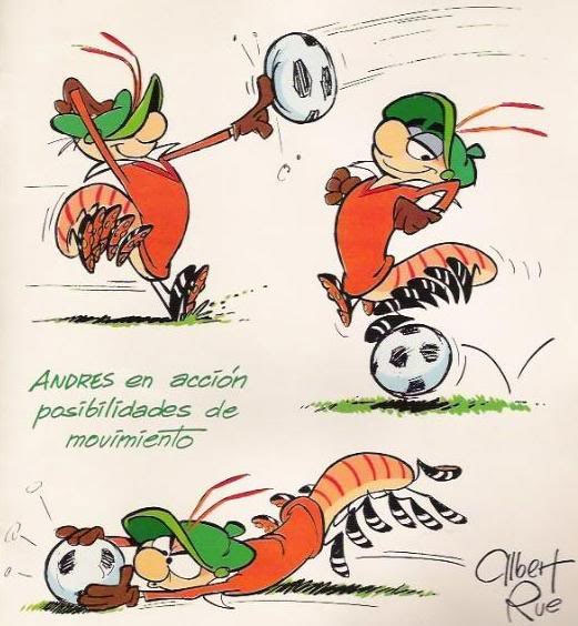 In the late 1950s, early cartoons by Albert Rué appeared in the Editorial Trébol science fiction magazine Naviatom. From the 1960s on, he combined his activities in animation with his work as a comic artist, all using the same lively cartoon style, inspired by fairy tales and classic animation. Notable funny animal mascots designed by Albert Rué were La Jirafa Pivot (Pivot the Giraffe) for Eurobasket (1973) and Andrés el Ciempiés (Andrew the Centipede) for the Spanish Football Players Association (1980).