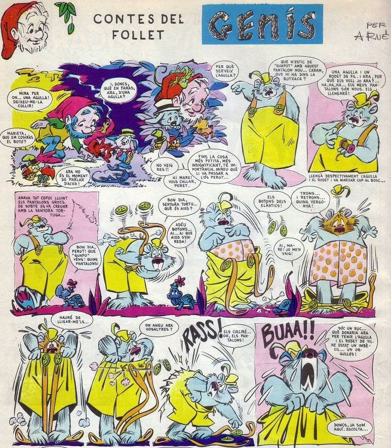 Rué's main feature in L'Infantil was 'Els Maravellosos Contes del Follet Genis' (1963-1967, 1970-1973), a series of one or two-page fairy tale stories with educational elements, starring the gnome Genis and a supporting cast of funny animal characters. Between 1973 and 1976, 'Follet Genis' also appeared as 'El Enanito Ginés' in the Madrid comic magazine Piñon. During the first year of L'Infantil, Rué additionally made 'Balú i Baló' (1963), with the jungle adventures of a funny animal monkey and elephant. After 1966, he made several poetic comic serial versions of popular tales, including 'Alice in Wonderland' ('Alicia en el País de las Maravillas', 1969), 'The Nutcracker of Nuremberg' ('El Cascanueces de Nuremberg'), 'Jack and the Beanstalk' (Jack y la Habichuela'), 'Hansel and Gretel' ('Hansel y Gretel') and 'Peter Pan' (1977). Between 1973-1975, the Abbey of Montserrat released the first four in book format in its 'Serviola' series. In the mid-1980s, 'Peter Pan' was reprinted in Zipi y Zape Especial #64 by Editorial Bruguera.