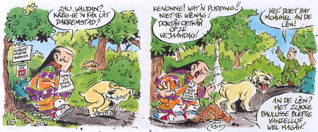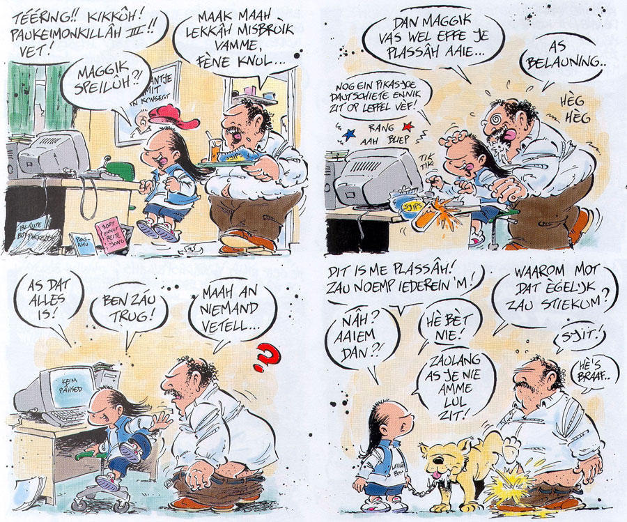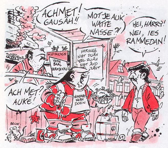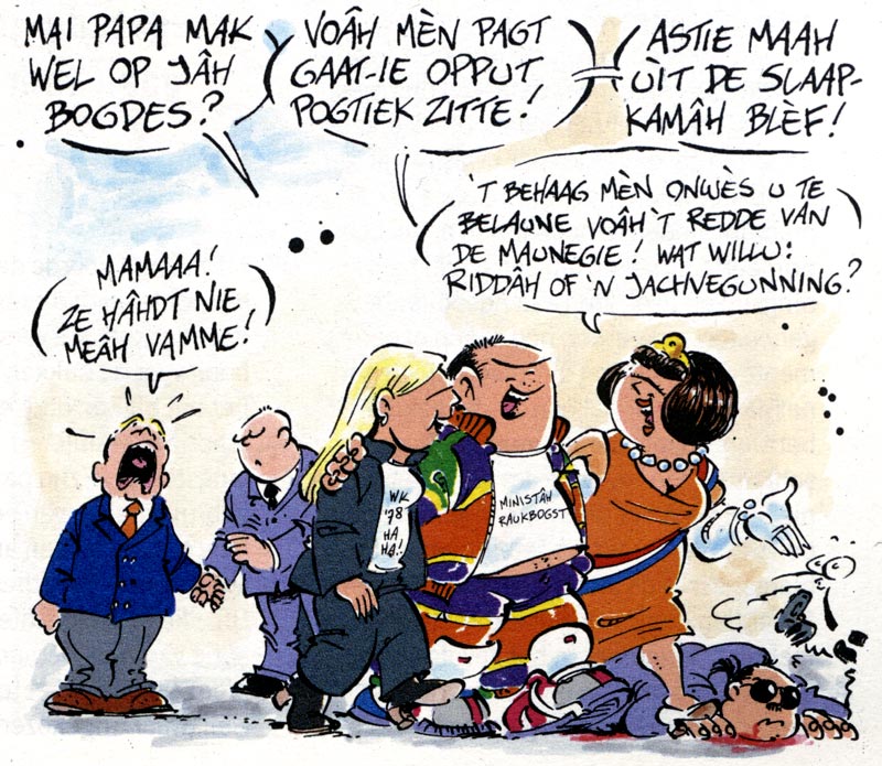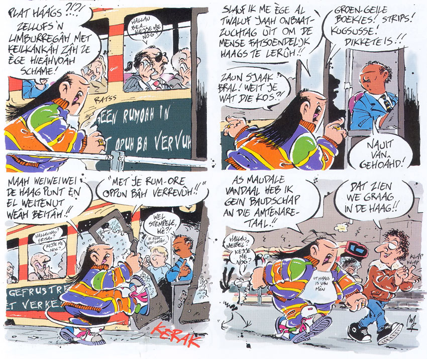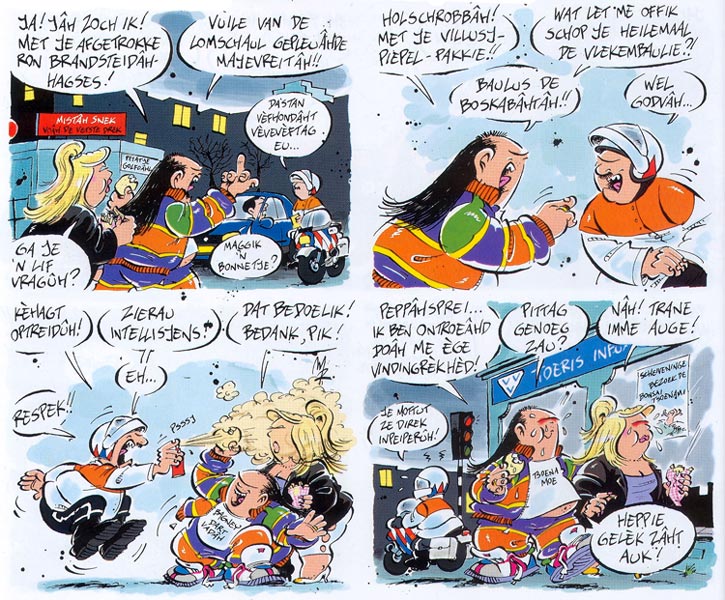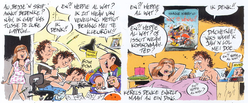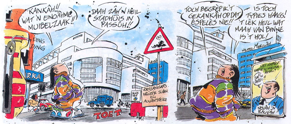 Standard Dutch is almost completely absent in 'Haagse Harry'. Every sentence is raw, unfiltered Haguenese, spelled phonetically. Interviewed by Peter Breedveld in Stripschrift #374 (March 2006), Rueb explained that people from The Hague use more synonyms to describe people and things than in any other city. To him, this is what makes Haguenese unintentionally funny. The juicy slang adds to the comic's regional flavor. As an absurd twist, even people from more civilized backgrounds, like the mayor and the Royal Family, speak Haguenese in 'Haagse Harry', and express the same stereotypical combative, cynical but jovial attitude as the other citizens. Rueb collected many Haguenese expressions he overheard in everyday conversations, and categorized them by topic in a personal database. Other words came from his own creativity. In his opinion, Haguenese was easier to transcribe phonetically than the Amsterdam or Rotterdam dialect. Still, he thought hard on how to convey a certain pronunciation. Once he considered adding audio recordings of the dialogues to the comic books, but this proved too impractical. Instead, he consulted dictionaries, even in other languages like French, to see how linguists wrote down certain vocal sounds phonetically.