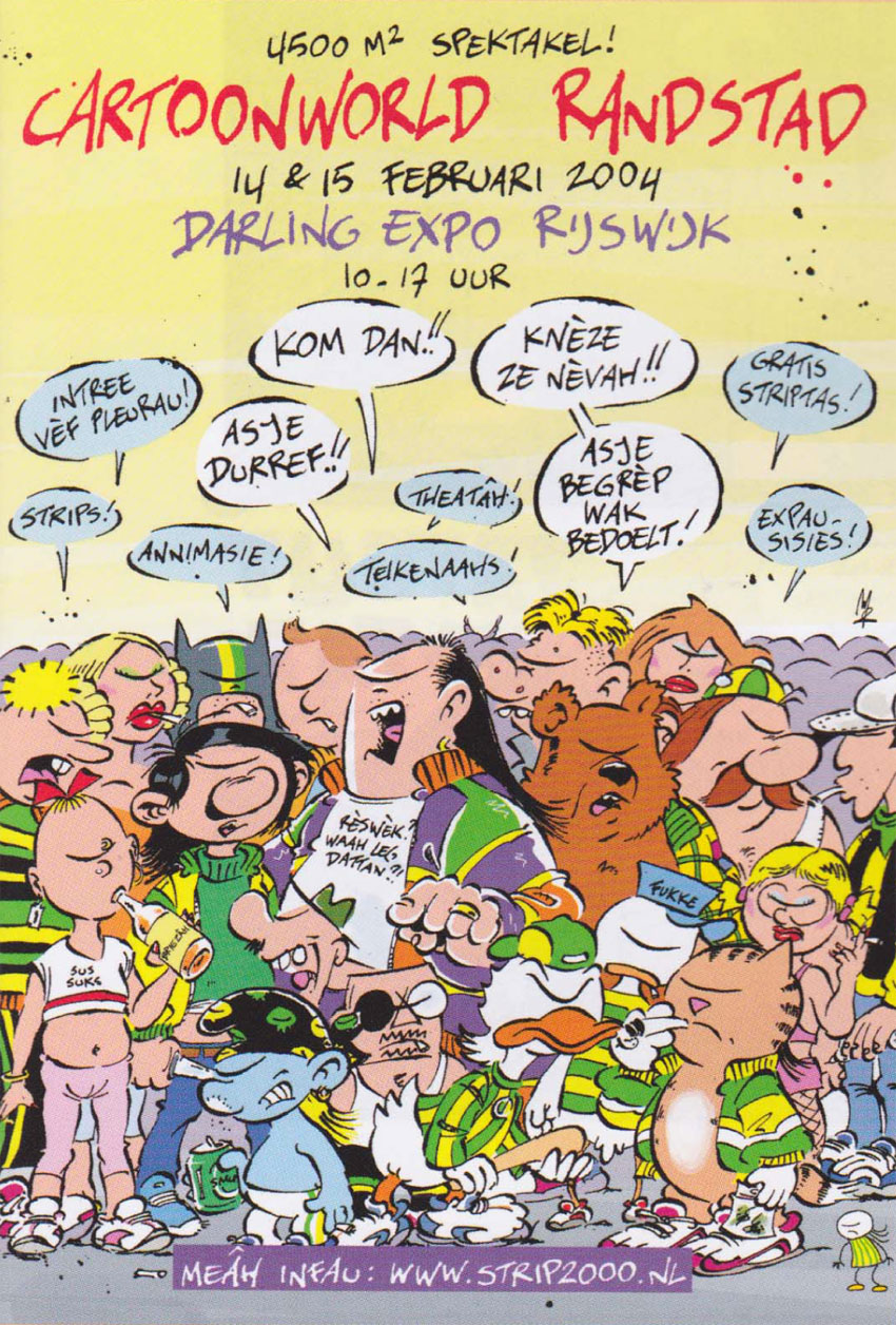 Poster/flyer for the 2004 CartoonWorld festival organized by Strip2000. There are cameos by (back row) Mark Retera's Dirkjan, Martin Lodewijk's Olga Lawina, Bob Kane & Bill Finger's Batman, Hergé's Tintin, Eric Schreurs' Joop Klepzeiker and Henk Kuijpers' Franka. In the second row, we spot Willy Vandersteen's Wiske, André Franquin's Gaston Lagaffe, Peyo's Smurf, Hein de Kort's Gemma, Peter de Wit's Sigmund, Walt Disney's Donald Duck, Marten Toonder's Olivier B. Bommel, Albert Uderzo's Obelix, Morris' Lucky Luke, Bastiaan Geleijnse, John Reid and Jean-Marc van Tol's Fokke, Windig & De Jong's Heinz, Jan Kruis' Catootje and (as a tiny figure in the left corner) Maaike Hartjes as herself.