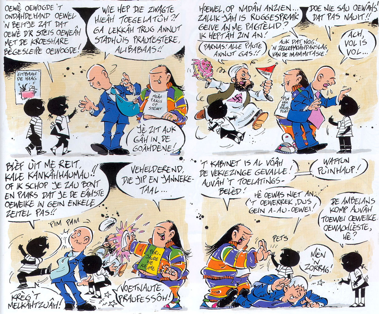 In his comics, Marnix Rueb poked fun at each and everyone. This 2002 comic from Haags Straatnieuws features far-right politician Pim Fortuyn feeling outraged that "two black people" (actually the children's book characters Jip en Janneke by Annie M.G. Schmidt and Fiep Westendorp) have entered the room. At the time, populist politicians like Fortuyn were often accused of using simple language and simplistic opinions to appeal to voters, nicknamed 'Jip and Janneke' language by journalists. Harry also confronts a Muslim fundamentalist in the same sequence. This comic ran in Haags Straatnieuws a few days before Fortuyn was murdered. As a result, the entire print-run was withdrawn.