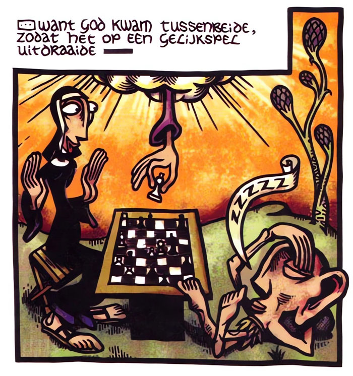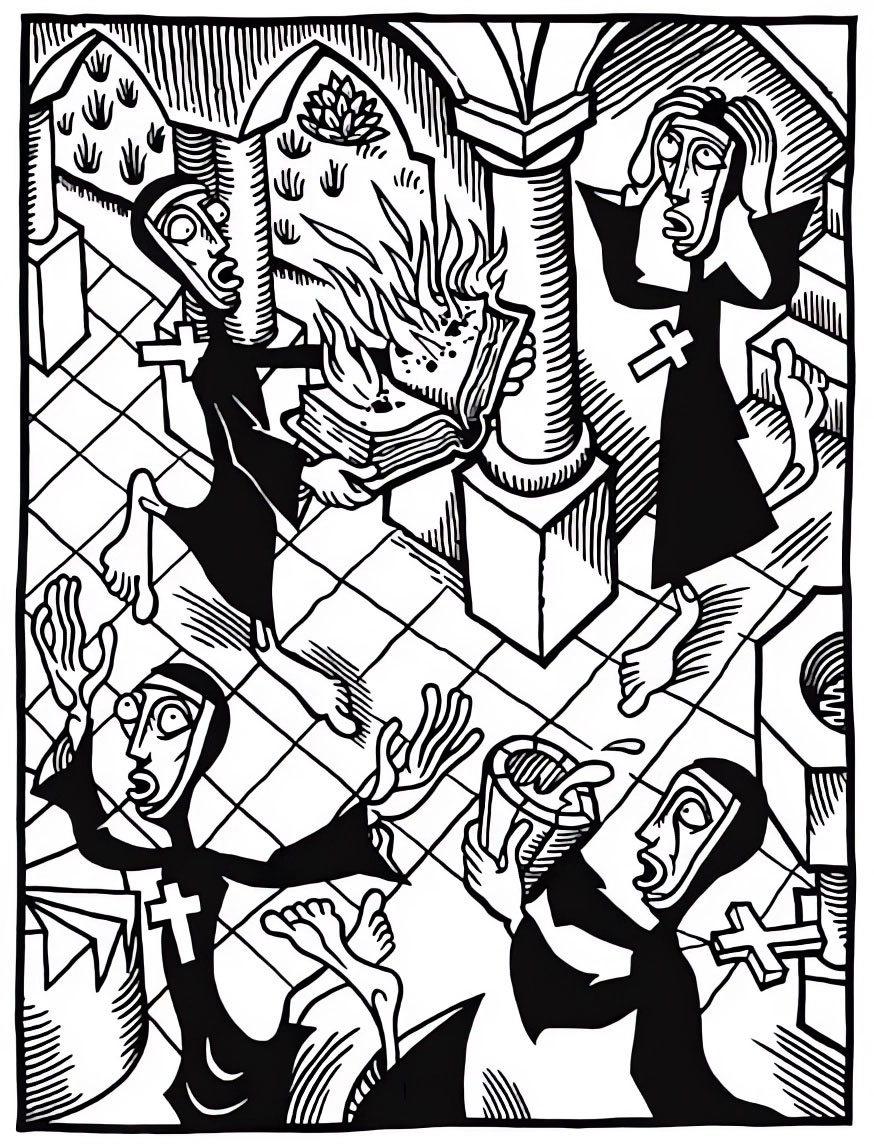 Since European culture during the Middle Ages was predominantly Roman Catholic, much of its art cannot be understood without knowledge about its liturgy. While Ruijters' home province of Limburg has a large Catholic community, he himself has been a lifelong atheist, so he has no emotional connection with religious imagery and symbolism. Yet, he does have a fascination with mysticism, since it deals with questions, as opposed to the readymade answers offered by organized religion. His book 'Sine Qua Non' (Oog & Blik, 2005) takes its inspiration from medieval tales of martyrdom, revelation and divine ecstasy, though with a tongue in cheek approach. As main characters, Ruijters chose a group of nuns. In medieval miniatures, many characters look identical, with only their clothing, or the descriptions, as a way to tell them apart, but since nuns all wear the same costume, it's even more difficult. Still, Ruijters knew from Peyo's comic strip 'The Smurfs', coincidentally also set in the Middle Ages, that virtually identical-looking characters could still carry engaging stories. The largely pantomime comic 'Sine Qua Non' was also published in Denmark and France.
