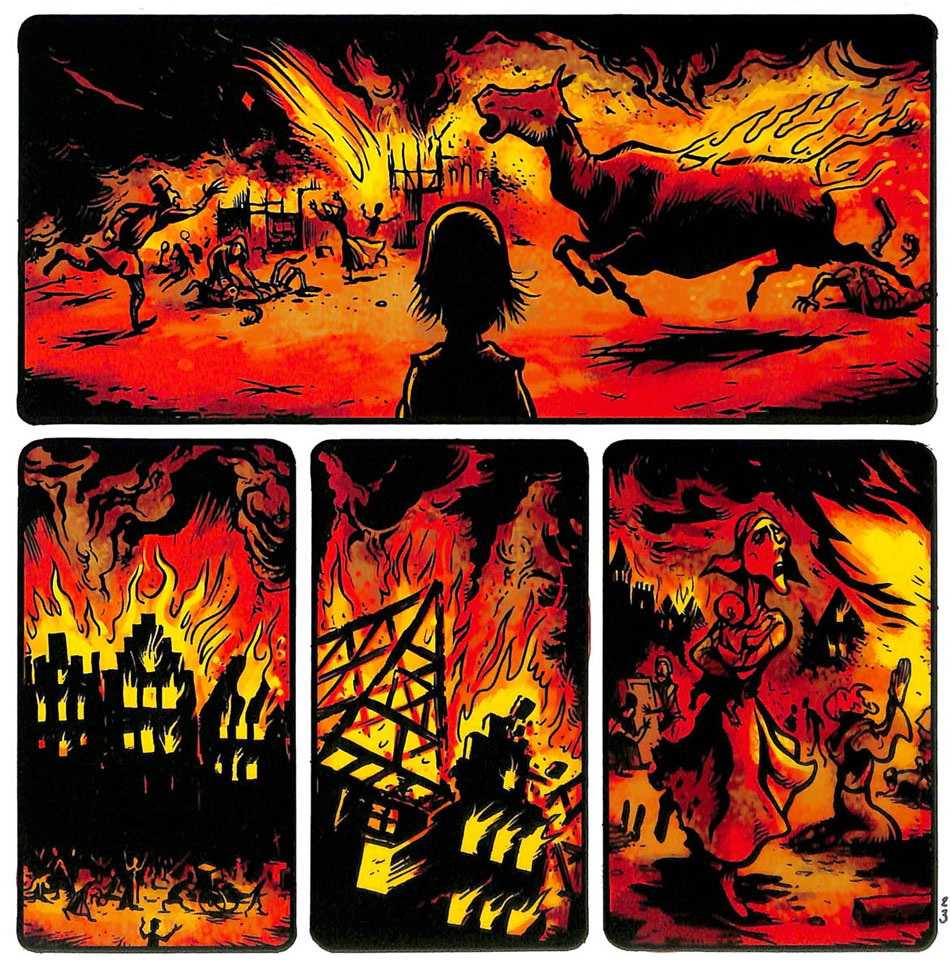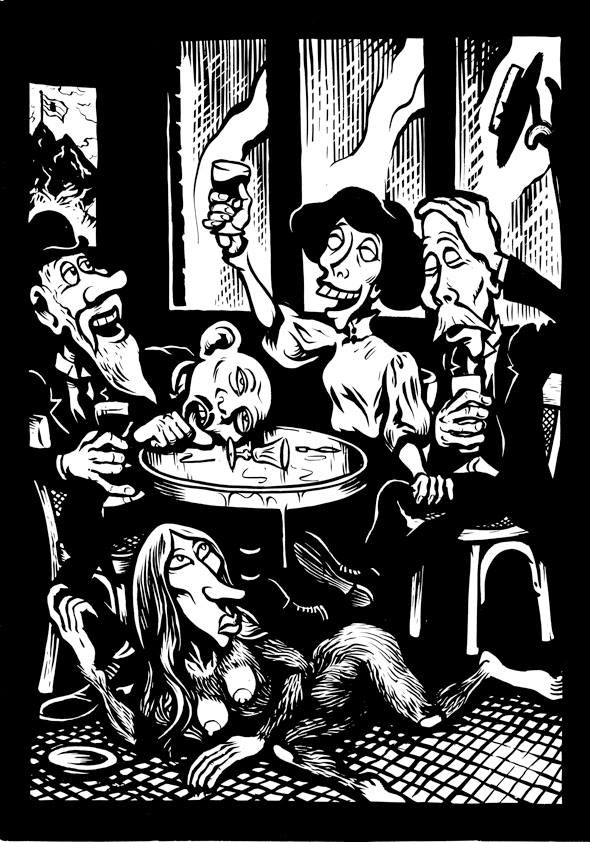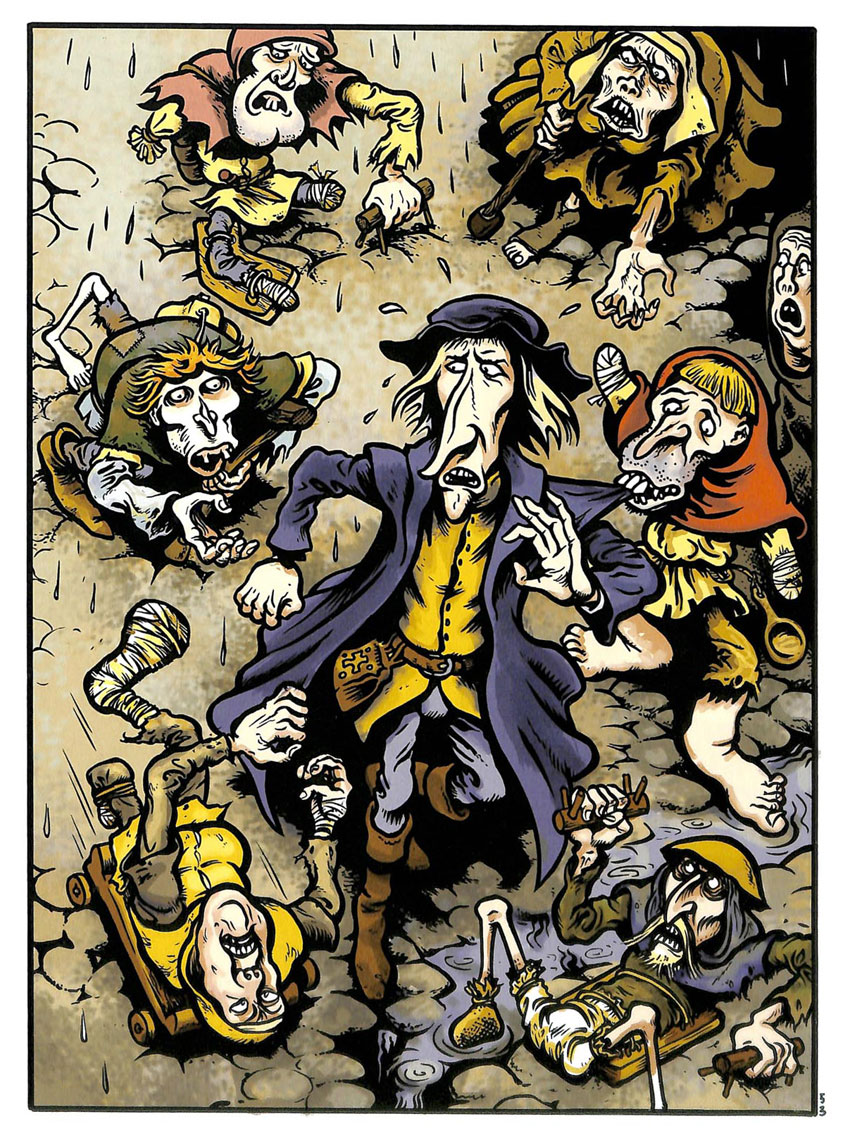 Ruijters liked the naïve but imaginative ways medieval artists envisioned the world around them. His 'Troglodytes' series therefore followed the same path, leaving out all dialogue and context to give the stories the same bewildering, mystic effect. In the same vein, Ruijters made 'Bestiarium' (2004), for which all illustrations were made on scratchboard. The book was released in black-and-white by French publishing company Le Dernier Cri, with a color reprint brought out in 2010. The same company also released a series of tarot cards by Ruijters, titled 'Tarot Corrupt' (2007), and '1348' (Le Dernier Cri, 2010), a book full of medieval cruelty set during the Black Plague. His mini-comic 'A Jest of Nature' (Mille Putois, 1998), was published in Canada. At Le Garage L, he also released a coloring book, 'Colorare Humanum Est' (2011).