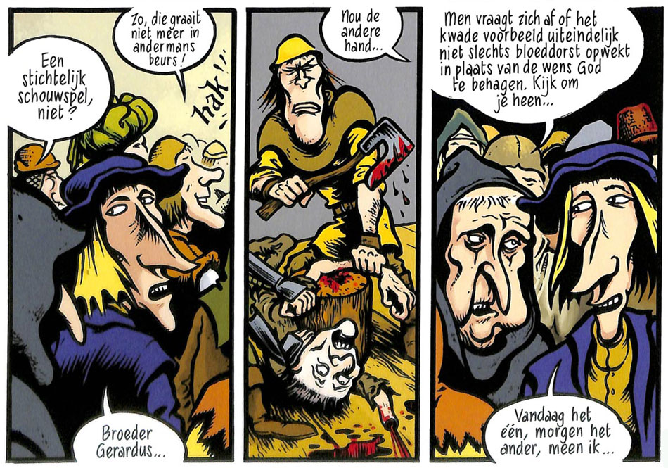 Another major challenge considering the real-life Bosch is that the artist spent his entire existence in his birth town. In the Middle Ages, traveling was time-consuming, expensive and often dangerous. Except for traders, pilgrims or occasional royal visits or military expeditions, most people rarely went beyond the close vicinity of their home village or town. Some artists did travel to Rome once in their lifetime, to study the world-renowned local paintings, sculptures and architecture, but, again, there is no direct proof that Bosch ever did so. This left Ruijters with very little basic facts, or geographical variation, to develop a narrative. But the plus side was that he still had a lot of creative freedom. He decided to move the scope of his story. In 'Jheronimus', Ruijters shows how painters in Bosch's lifetime lived and worked. Bosch has to deal with business affairs, unsatisfied customers and deadlines. Ruijters also provides a view of medieval society. Roman-Catholicism is an integral part of life, with many people worrying about their retribution in the afterlife as much as they are concerned with every-day problems. The streets are filthy, while handicapped beggars, fortune tellers and robbers harass the more fortunate people for money. Doctors are indistinguishable from mere quacks. Public executions offer weekly spectacles. Ruijters also referenced historic events, like the Great City Fire of 1463, when Bosch was still a child. Many historians have speculated that the boy must have been a witness of this disaster, making a direct link with the Hellish fires depicted in his paintings.