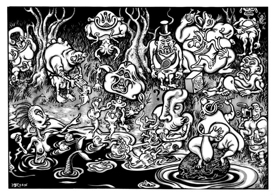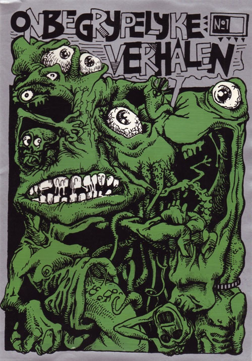 Initially embracing the atmosphere, freedom and relaxed attitude of the underground comics movement, Marcel Ruijters began his career in the Dutch alternative and small press comics scene of the 1980s. In 1984, his first contributions appeared in the indie comic magazine Coyote. When he couldn't find a publisher interested in publishing his offbeat work, he turned to self-publishing. Together with a couple of artist friends, he began the Monguzzi foundation, through which they produced, published and distributed their own Xerox-printed comic books. Between the late 1980s and early 1990s, Ruijters produced dozens of these DIY comic books, aimed at underground audiences both in the Netherlands and abroad. These included thirteen issues of the underground comic magazine Mandragoora (1987-1993), and seven issues of his 'Onbegrijpelijke Verhalen' series ("Incomprehensible stories", 1988-1992), featuring improvised stories with grotesque and surreal creatures.