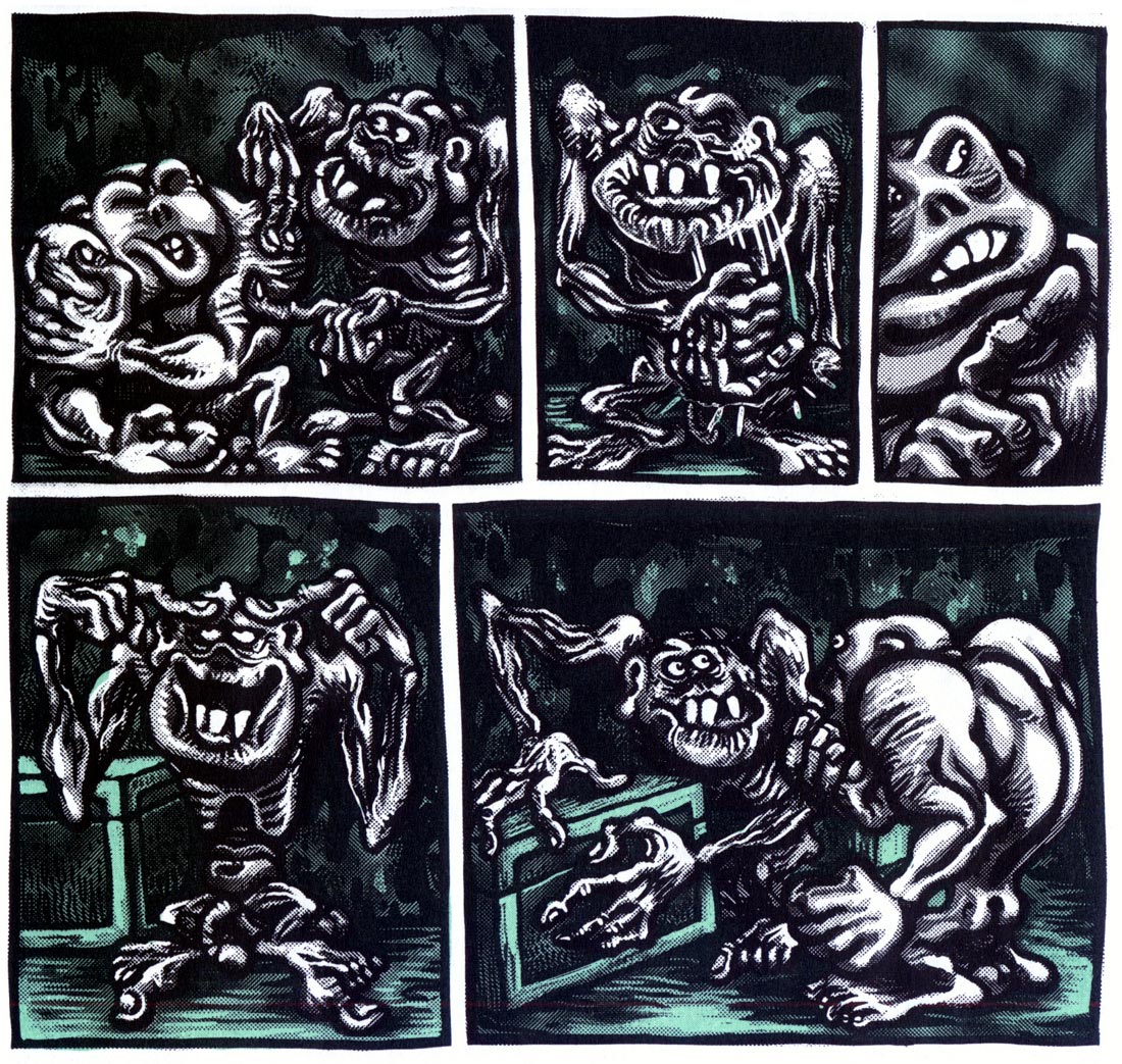 Inspired by "Orgone", a concept by the Austrian psychoanalyst Wilhelm Reich's of an hypothetical universal life force, Marcel Ruijters created his pantomime comic series 'Troglodytes' (1999-2007), about a cruel and mysterious subhuman species living in murky caves. Three volumes were published by Oog & Blik: 'Troglodytes' (1999), 'Troglodytes 2: Mappa Mundi' (2001) and 'Troglodytes: Vox Insana' (2007). In a way, the Troglodytes marked the transition of Ruijters' underground comix influence into thematics inspired by medieval art, and especially that time period's miniatures. Similar to the miniature subgenre "bestiaries", the 'Troglodytes' stories have no real plot, but center on grotesque animals, demons and other fantasy creatures. Artists who drew such bestiaries depicted various beasts, presented in the style of a travelogue, or what we would nowadays refer to as an animal taxonomy. However, in the Middle Ages, most of the world was still unexplored, leaving people to wonder and fear what might be lurking far outside their own secluded home town or village. Some travelers and explorers described things they had seen, which artists then visualized in drawings. Unavoidably, the travelers remembered things wrong, misinterpreted what they had seen, or simply exaggerated their stories, while the artists further delved into their own fantasies to fill in the blanks. Other artists just plainly made things up, based on what they imagined life in faraway countries or oceans might be like. Typical examples are humans with a head in their body, or one large foot to hop about on. Other creatures were simply believed to exist, because nobody ever proved otherwise, like giants, witches, dragons, unicorns, gnomes, elves, fairies, sprites, trolls, devils, griffins, phoenixes, werewolves, vampires, ghosts, mermaids and gigantic sea serpents.