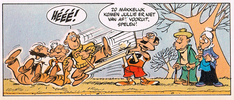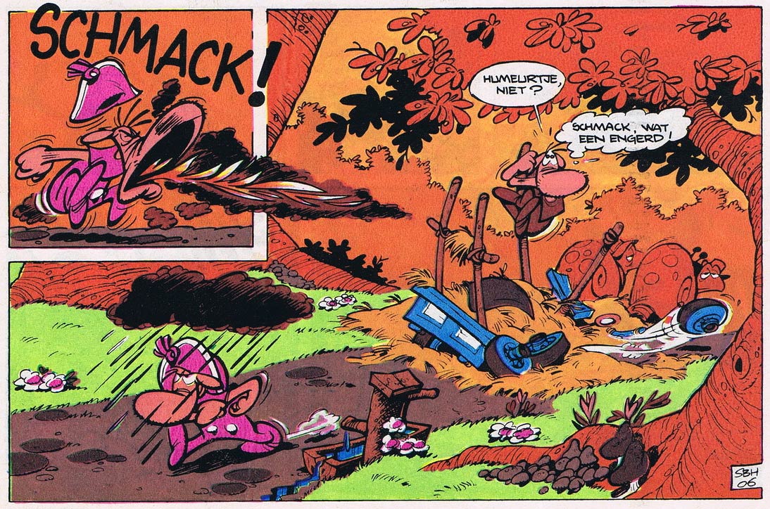 In addition, Ryssack made a story about strange creatures called 'Les Schmouks' ('De Schmaks') in cooperation with Michel Noirret for Tintin in 1976. He gave his sarcastic view on current affairs in the Belgian edition of Pilote in 1972-1973 and illustrated Yvan Delporte's educational pages in Le Journal de Mickey. Together with Jean-Pol, he worked on the 'Annie en Peter' story 'De Kreet van Kwibus' (1984) and, with Jean-Pol and  Eric de Rop, a comic story based on the German animated TV series 'Sport-Billy' ('Een Rare Vogel' in Zonnestraal, 1983). In 1984, he wrote the script of 'Stuwadoors en Maneschijn' for the gangster comic 'Johnny Goodbye' by Dino Attanasio in Eppo.