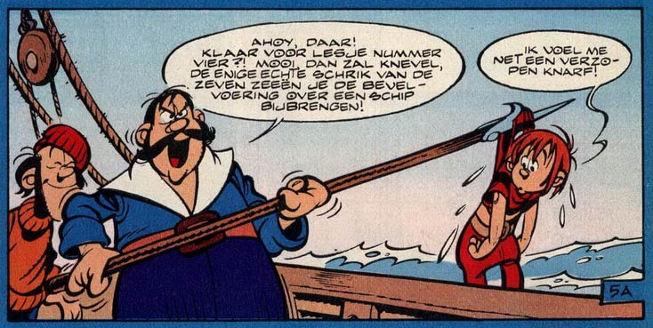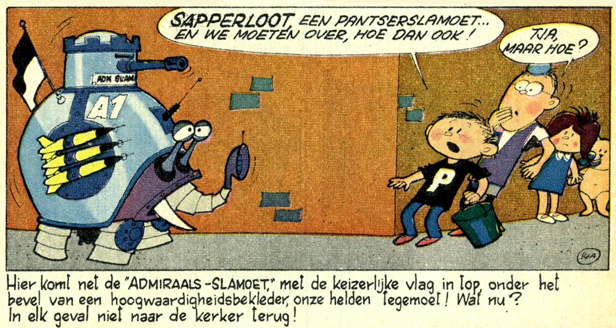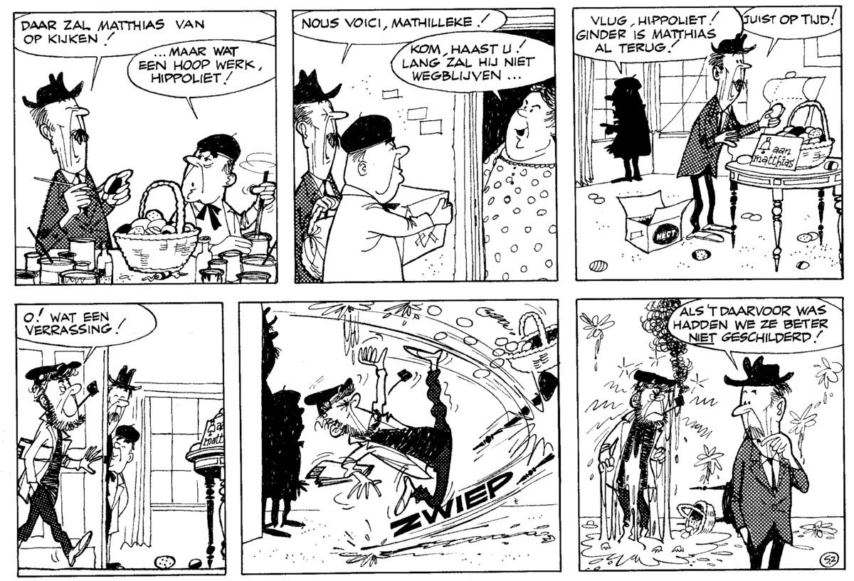 Four years later, in 1957, Ryssack created the comic 'Kapitein Matthias', based on the Flemish TV sitcom 'Schipper Naast Mathilde' (1955-1963). The celebrity comic was published in Humo, scripted by controversial journalist and opinion maker Johan Anthierens. Around the same time another short-lived comic strip, based on the same TV show, 'Geschipper Naast Mathilde' (1960-1962), was syndicated in De Zondagmorgen, created by Willy Vandersteen, Eduard De Rop and Eugeen Decamps.