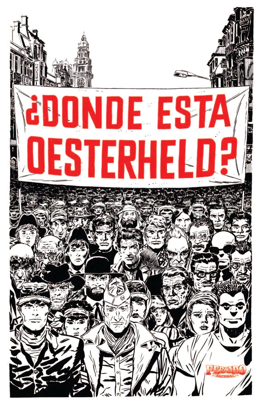 Despite his impressive oeuvre, Felix Saborido has gained most notoriety for his poster '¿Dónde está Oesterheld', in which several comic characters demand justice for comic writer Hector Germán Oesterheld, who mysteriously disappeared during Jorge Videla's military dictatorship in 1977. It was published in the magazine Feriado Nacional in 1983, and many thought it was drawn by Hugo Pratt.