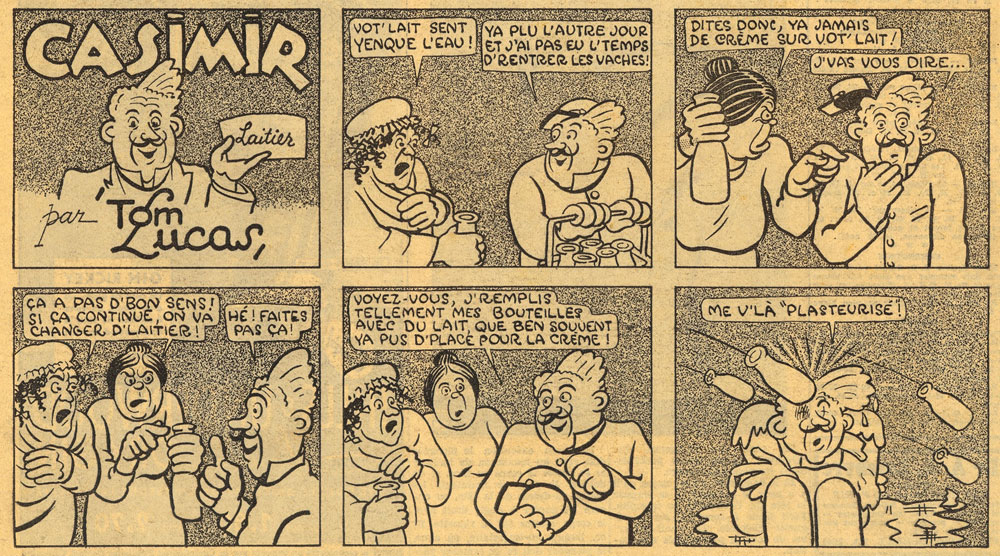 On 11 August 1935, 'L'Oncle Pacifique' received a companion comic titled 'Casimir' (1935-1945). This gag comic ran as a six-panel comic strip on the bottom of each page. Casimir was a dumb person who always found himself in wacky situations. The feature was signed "Tom Lucas", a cartoonist whose identity has remained a mystery. Historians believe it may have been Saint-Loup himself under another pseudonym, given that the artist was capable of switching graphic styles. Another possibility is that the comic was drawn by Hector Brault, an assistant of Saint-Loup in the second half of the 1930s. Either way, both comics enjoyed a similar long run. Both debuted in 1935 and were absent from papers during the summers of 1943 and 1944. On 2 January 1944, L'Oncle Pacifique and Casimir appeared together in a crossover episode. After 26 August 1945, both comics were discontinued. It is also possible that Brault only worked on 'Casimir' for a limited period and that Saint-Loup was the artist during the rest of its run.
