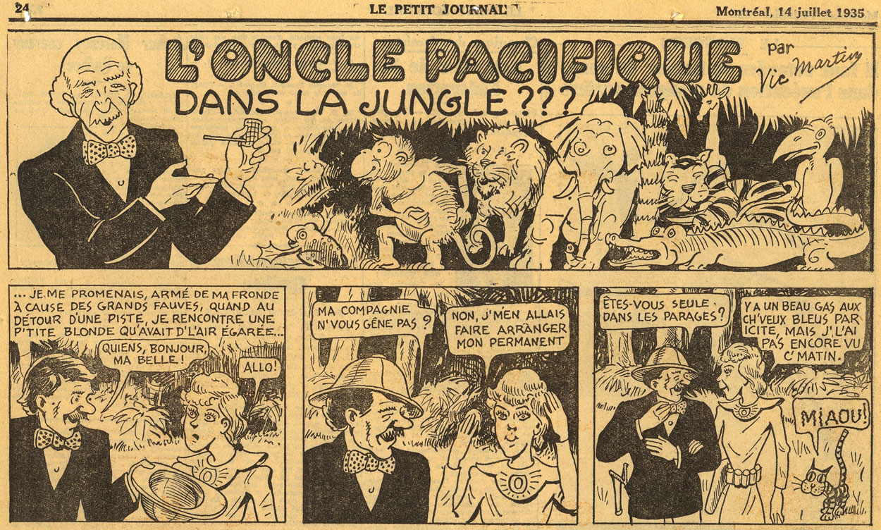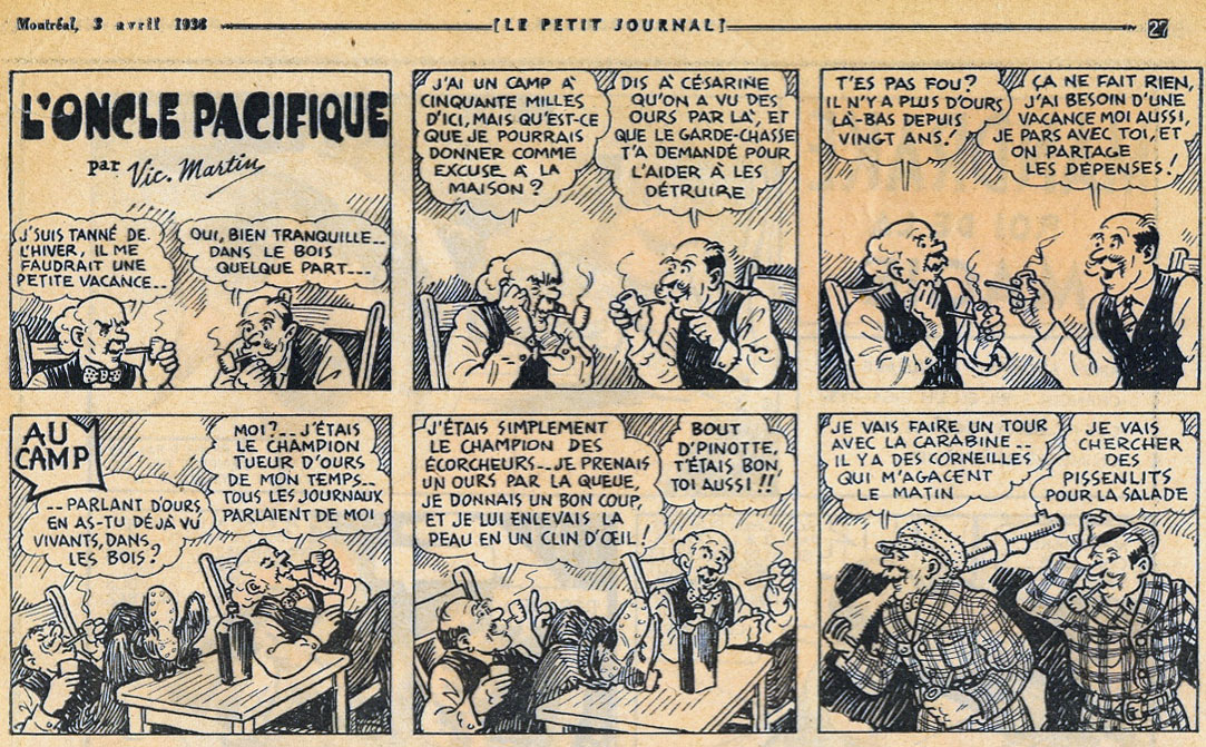 On Sunday 26 May 1935, Saint-Loup launched his comic strip 'L'Oncle Pacifique' (1935-1945) in the weekly newspaper Le Petit Journal, signing it with the pseudonym "Vic Martin". It was a humor comic about a wise, old and astute French-Canadian uncle, whose full name was Pacifique Poilfin. The white-haired, mustached and pipe-smoking elderly man reminisces about his incredible past adventures, while recounting amusing anecdotes and situations, leaving his relatives and the youngsters in his presence stunned with his sharp and witty observations. During the first three months of its run, 'L'Oncle Pacifique' was published as one full page. The feature ran uninterrupted for a decade, with the exception of the summer holidays of 1943 and 1944. On 26 August 1945, the final episode saw print.